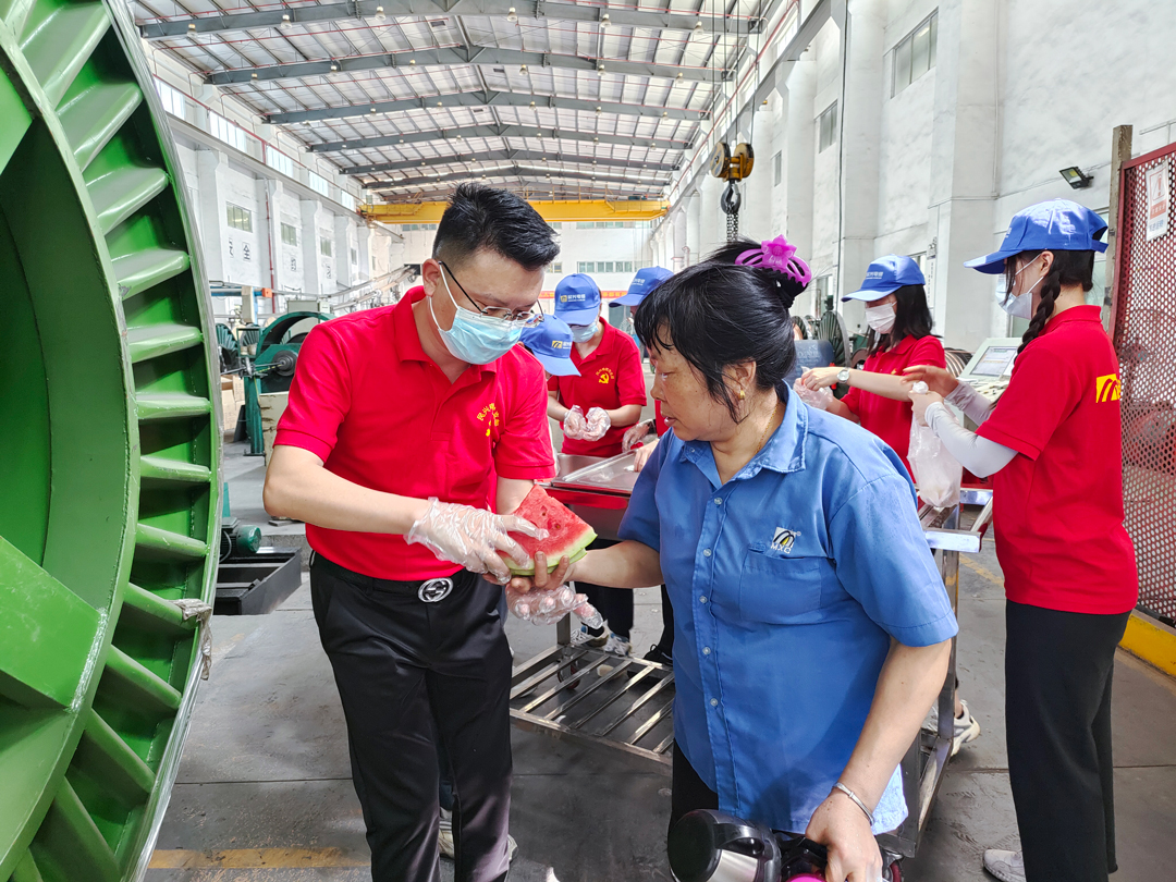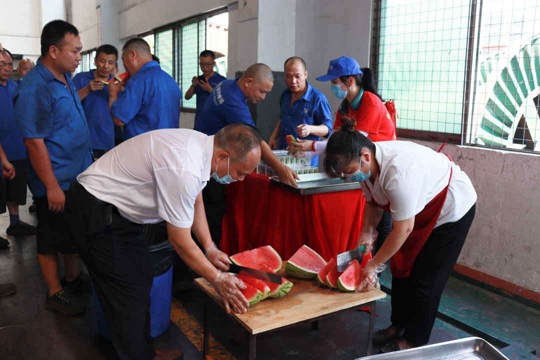 公司黨團(tuán)志愿服務(wù)隊志愿者為一線工人送上西瓜